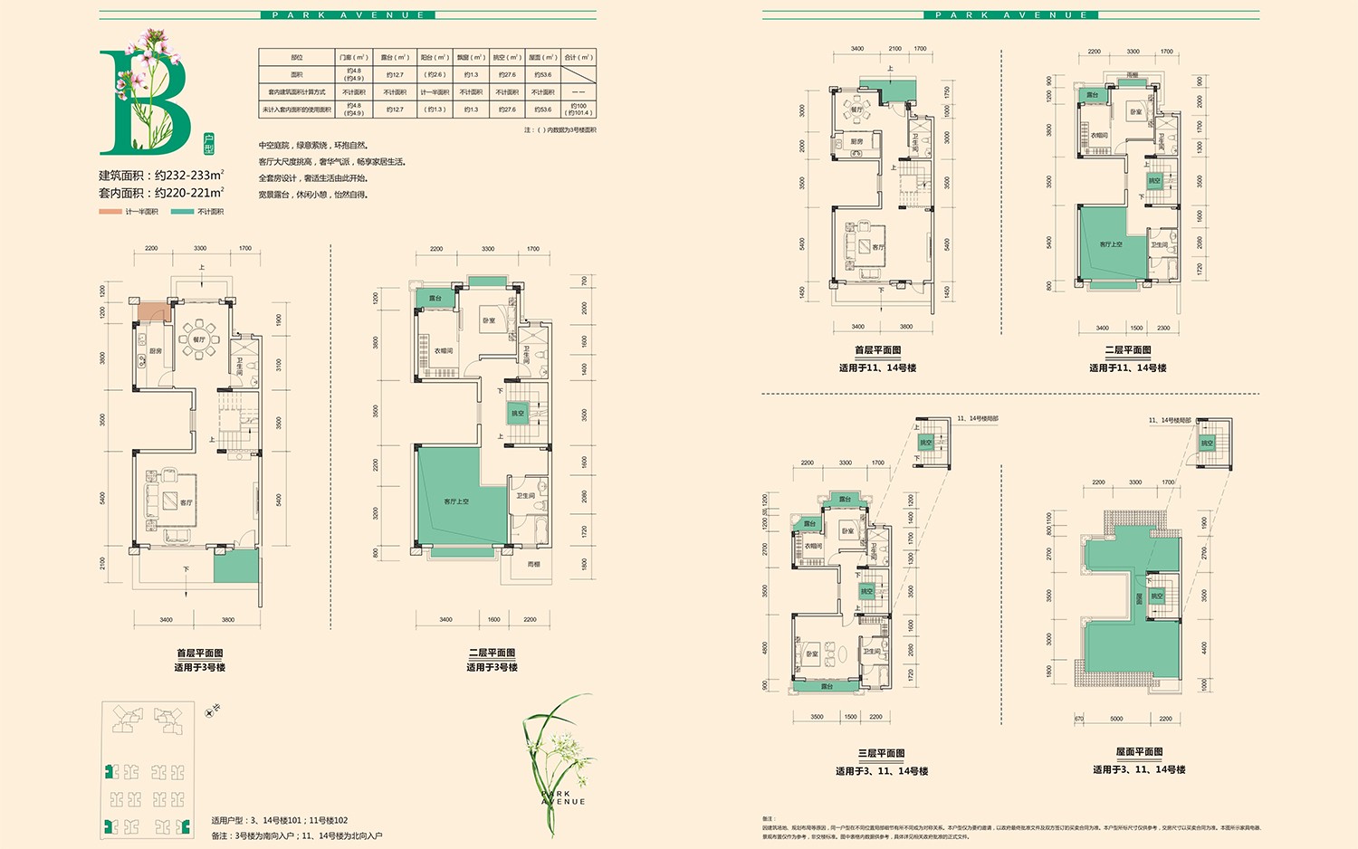 建筑面積:約232-233m2。套內面積:約220-221m2。