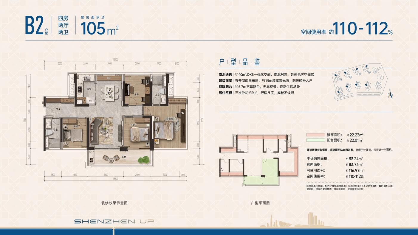 B2戶型,105平方米四房兩廳兩衛