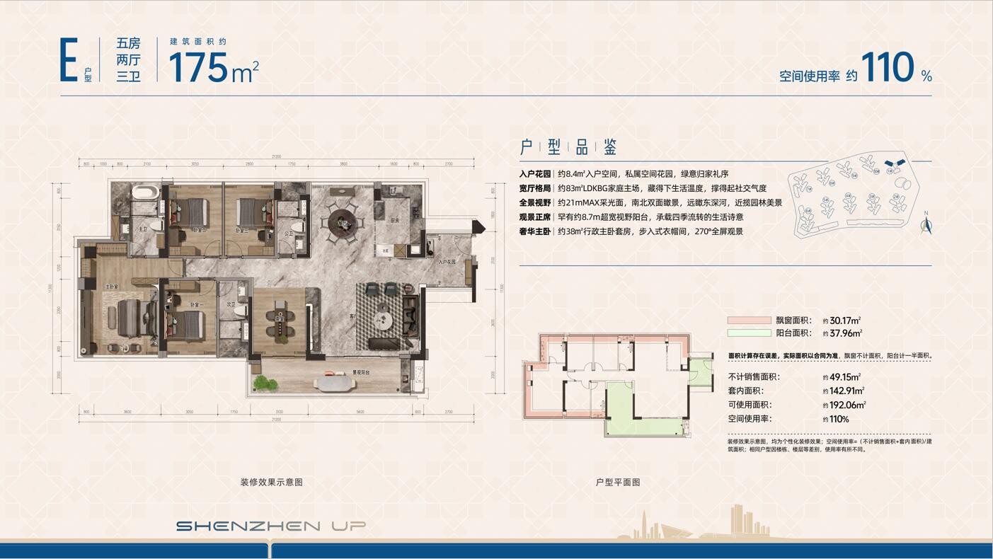 E戶型,175平方米五房兩廳三衛